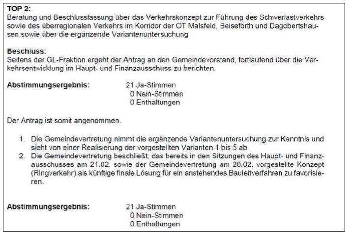 Bereits bei der Beschlussfassung war jedoch zu befürchten, dass sich der Erwerb der alten Bahntrasse verzögern könne. Insbesondere die aktuelle Produktionsausweitung der Fa. Schumacher, einhergehend mit erhöhtem Verkehrsaufkommen, erfordert hier eine dringende Handlung des Gemeindevorstandes. Um die Bewohner von Beiseförth zu schützen schlägt die GL vor, als Übergangslösung auch die Aufstellung einer Lichtzeichenanlage, ähnlich wie bei Baustellen, zu prüfen. Dadurch könnte Begegnungsverkehr vermieden werden. Dies hätte auch die Folge dass der Abkürzungsverkehr durch die Ortslage Beiseförth unattraktiver wird und sich verringert. Der genauen Standort der Anlage müsste der Gemeindevorstand mit den Fachbehörden abstimmen. Auch für die Zufahrtsmöglichkeit von LKWs in die Kerngemeinde Malsfeld sieht das Konzept eine Querung der Bahntrasse im Bereich des Feuerwehrgerätehauses in Malsfeld vor. Ebenso wie für Beiseförth erkennt die GL auch hier leider keinerlei Planungs- und Umsetzungsschritte zur Realisierung des Verkehrskonzeptes.